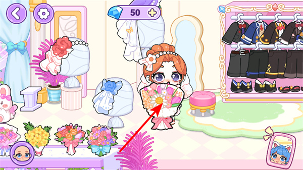3、为角色搭配鲜花道具,鲜花搭配能提升角色的装饰效果,让角色在场景中更具美感和氛围感。