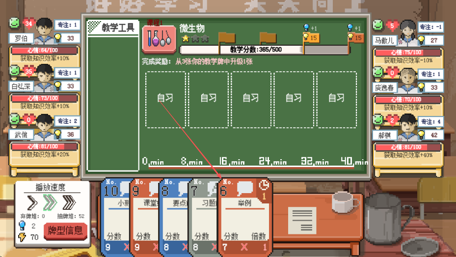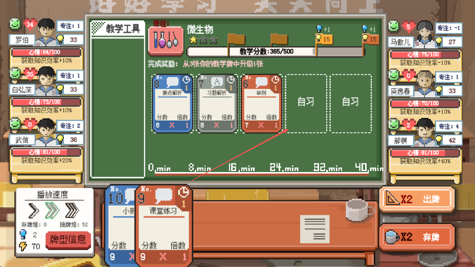 4、完成规划后点击出牌按钮,执行教学安排,提升学生知识获取效率和教学分数,推进游戏进程。