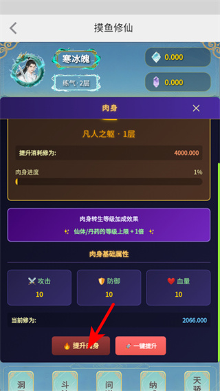 4、进入肉身界面后,点击提升肉身按钮消耗修为值强化肉身等级,肉身提升能增加攻击基础属性,助力后续的关卡挑战资源获取。