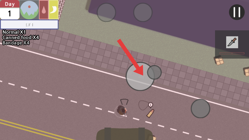 2、基础操作与探索:通过左侧控件控制角色移动,在场景中探索收集材料,右侧控件用于发动攻击,借助上帝视角观察丧尸位置,提前规划路线规避不必要的冲突。