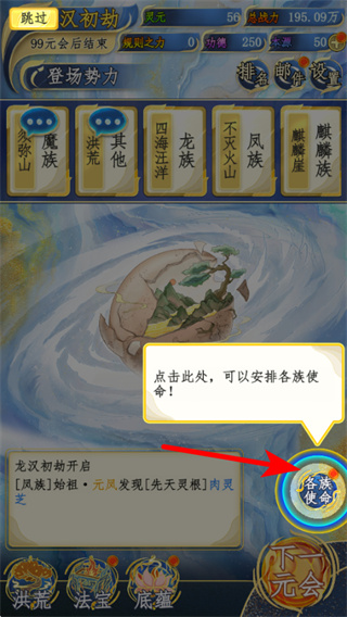 4、在主场景中点击各族使命按钮,这是安排势力发展任务的重要操作,点击后可分配各族的行动指令,推进势力的成长与剧情的发展进度。