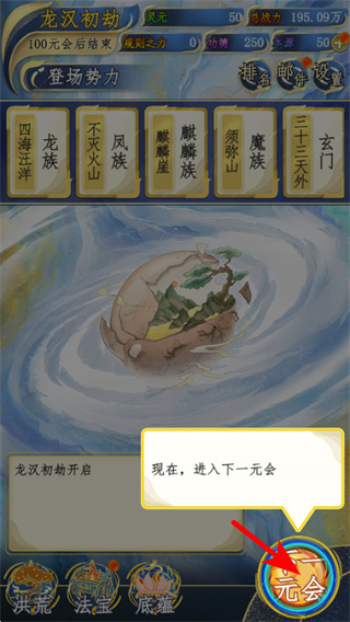 2、进入龙汉初劫场景后,点击元会按钮,这是推进时代进程的基础操作,触发后会进入下一阶段的剧情与玩法,解锁新的势力事件与资源内容。