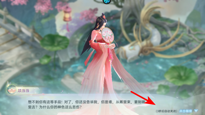 1、在剧情对话界面,点击点击继续按键,可推进与项当当的剧情对话,了解游戏背景故事,解锁新的游戏内容。