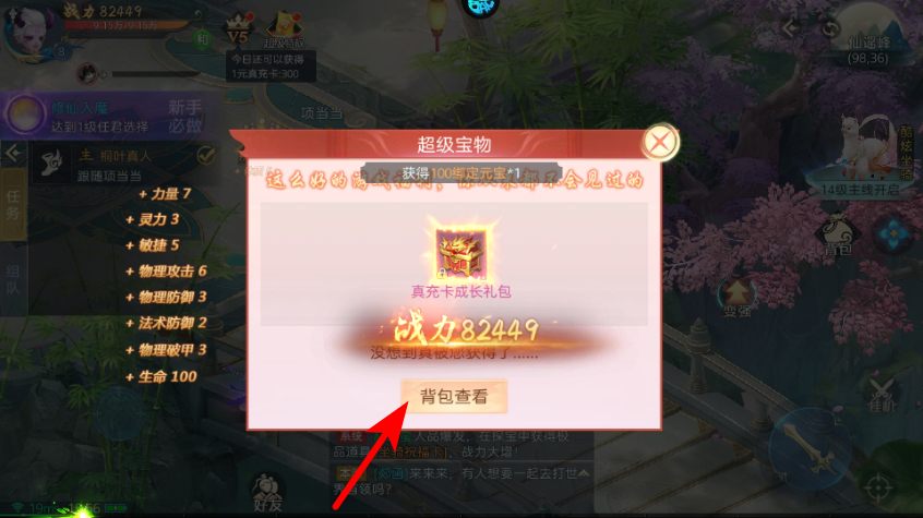 2、获得超级宝物后,点击背包查看按键,可进入背包界面查看获得的真充卡成长礼包等道具,助力角色战力提升。
