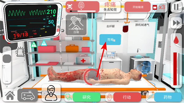 4、根据病人病情,点击相应医疗操作按钮如充电,实施针对性治疗,及时调整治疗方案可提升病人存活率。