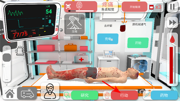 2、进入治疗界面后,点击行动按钮可选择医疗操作,行动是实施治疗方案、挽救病人生命的核心操作。