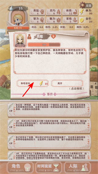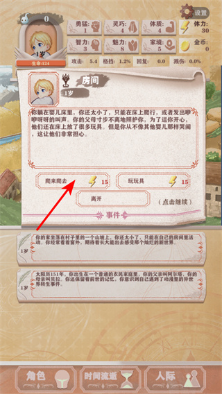 3、面对童年事件选择,需根据属性提升需求进行点击,这是塑造角色能力的关键步骤,选择时需兼顾勇气属性的均衡发展。
