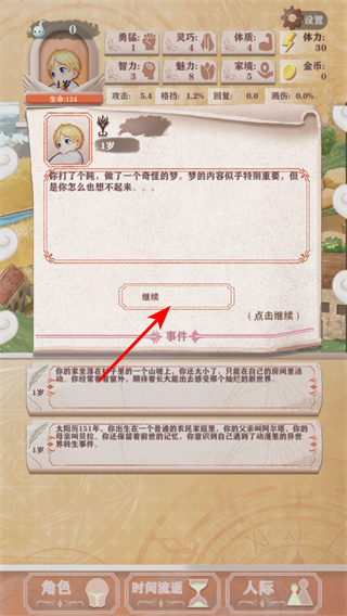 2、在剧情界面点击继续按钮,可推进角色的人生阶段,这是解锁新事件和属性的关键操作,点击时需关注剧情的发展走向。