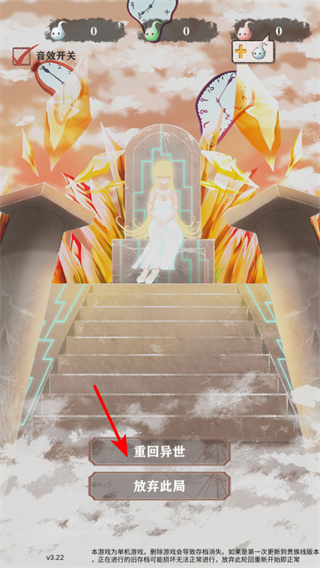 1、游戏中点击重回异世按钮,可进入人生模拟的冒险旅程,这是开启游戏的关键操作,点击后将正式进入角色的成长剧情。