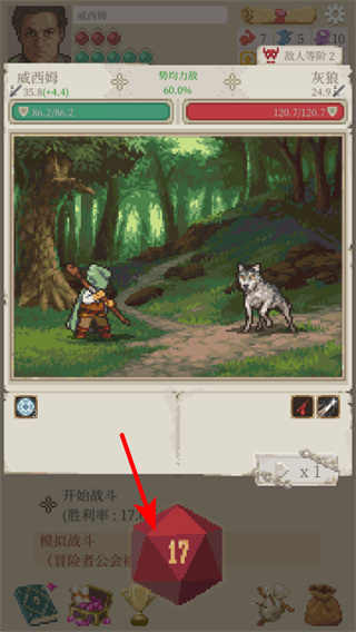 2、游戏中依照红色箭头指引,点击界面中的骰子图标,会触发战斗前的数值判定,数值会影响战斗的胜率,通过此判断当前战斗风险程度。