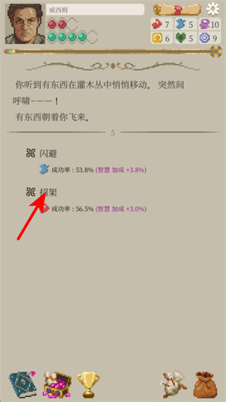 3、紧跟红色箭头指引,在突发事件界面选择招架选项,该选项会显示对应的成功率与属性加成,选择后会触发对应判定,规避伤害获得属性提升。