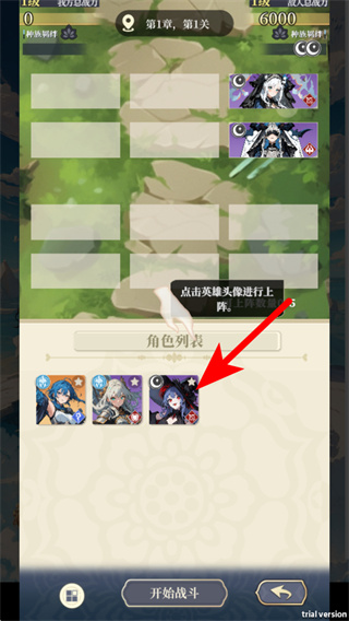 4、在角色列表界面,点击箭头标注的角色头像,这是调整上阵角色的必要操作,选择对应角色即可完成阵容配置。