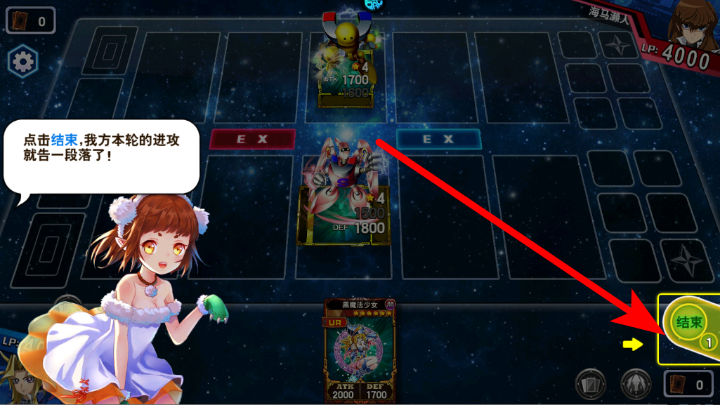3、完成怪兽召唤等操作后,点击结束按钮,即可结束己方本轮的进攻阶段,进入对手回合,等待对手行动,同时观察场上局势变化。