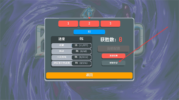 3、在该界面查看游戏进度数据,可点击重设配置调整当前设置,或用解锁全部功能解锁全部卡牌推进流程。