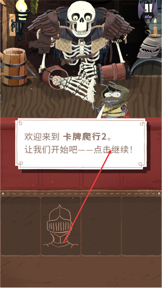 2、进入游戏后出现欢迎来到卡牌爬行2的提示,点击该提示区域即可继续推进游戏流程。