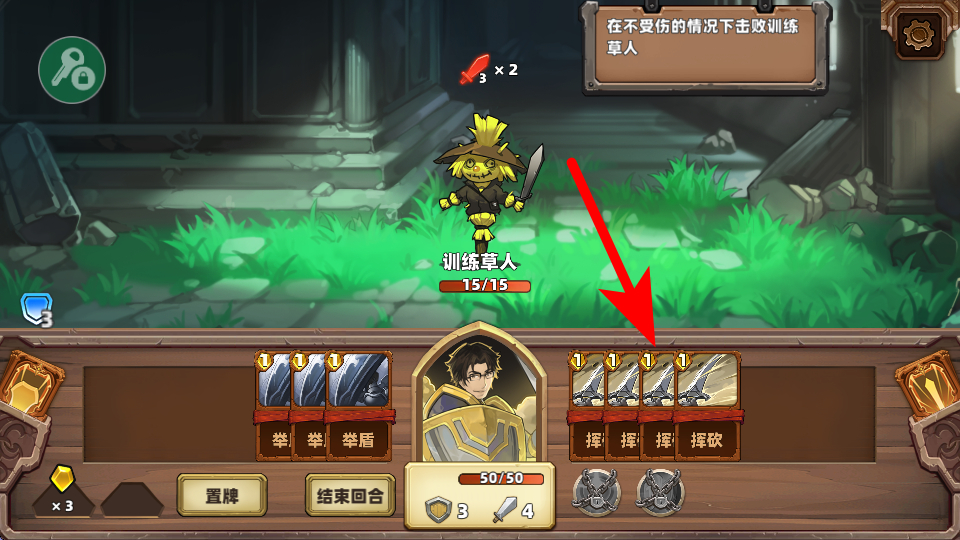 3、除了防御卡牌,还有挥砍等攻击类卡牌,在合适的时机打出这些攻击卡牌,能对敌人造成伤害,推进战斗进程。