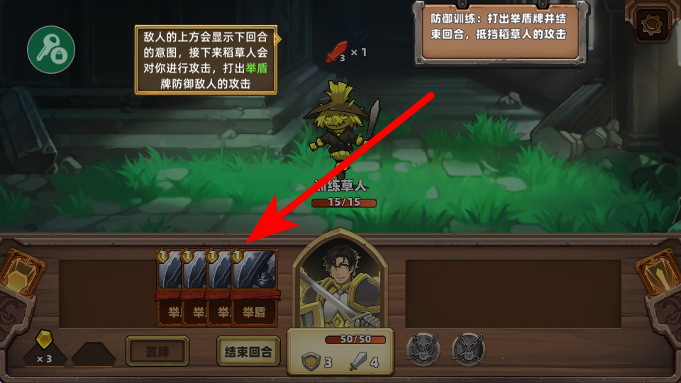 2、战斗时,敌人上方会显示下回合意图,当敌人要攻击时,可打出举盾类卡牌,以此防御敌人的攻击,保障自身安全。