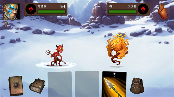 3、然后就可以操控自己的英雄进入到雪山背景之下的战场中,下方会随机为你分配三个不同技能卡牌,选择三个卡牌之中的一个技能对敌人进行进攻;