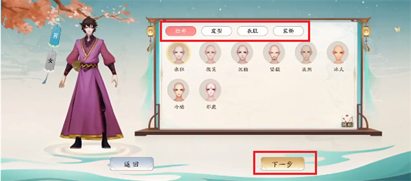 3、此时玩家将会进入到面部五官的选择界面之中,可以自由的点击上方的分类,以为自己进行形象的设计,设计好之后需要点击【下一步】按钮;