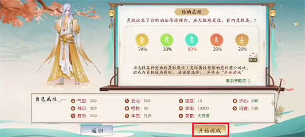 5、此时屏幕上将会展现出玩家的各项灵根情况,随之点击【开始游戏】按钮即可进行游戏闯关;