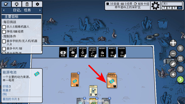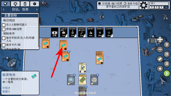 2、卡牌操作,空格暂停,卡牌堆叠是核心,资源卡+建筑卡可合成防御设施,资源卡+科研卡能解锁高级科技。