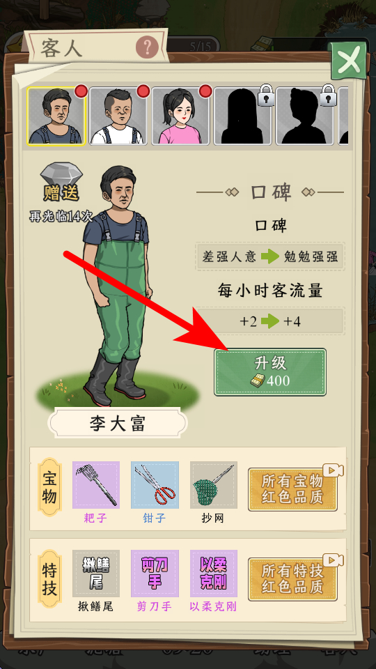 4、客人板块中,可对客人进行升级,升级消耗指定数量的道具,升级后客人的口碑会提升。