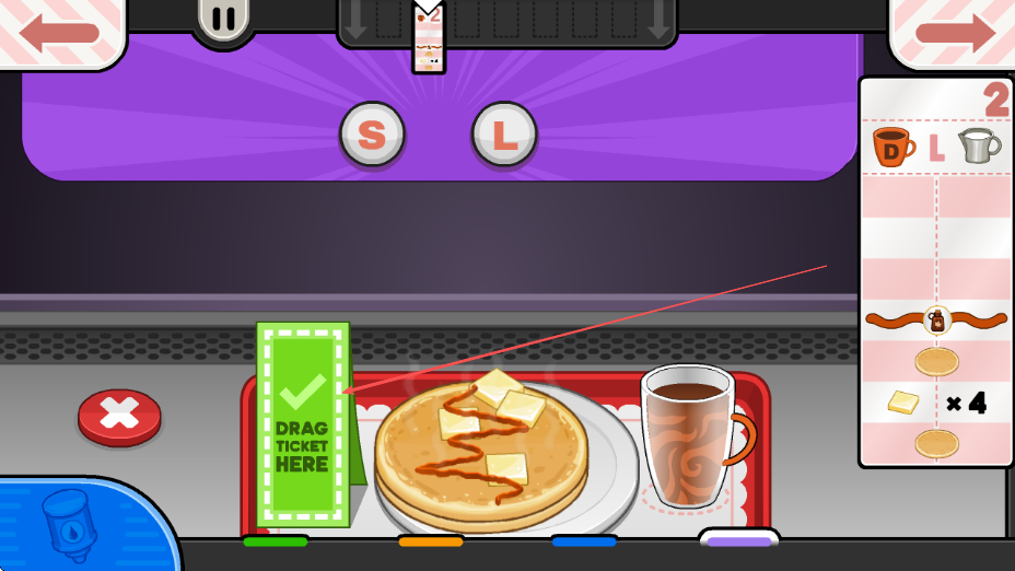 4、把做好的煎饼和饮品放托盘,将订单小票拖到DRAGTICKETHERE指定区域交付订单。