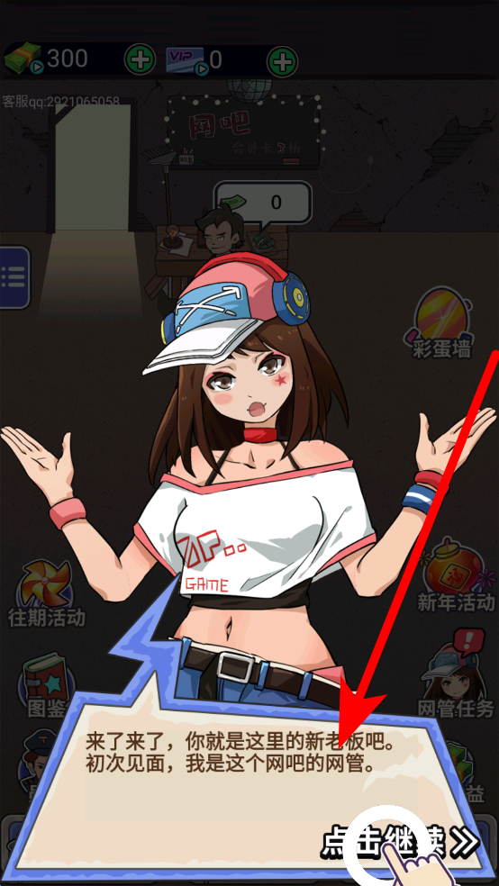 1、首先会有剧情引导,出现相关画面时,点击点击继续,推进剧情,了解成为网吧老板的背景与初始设定。