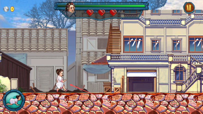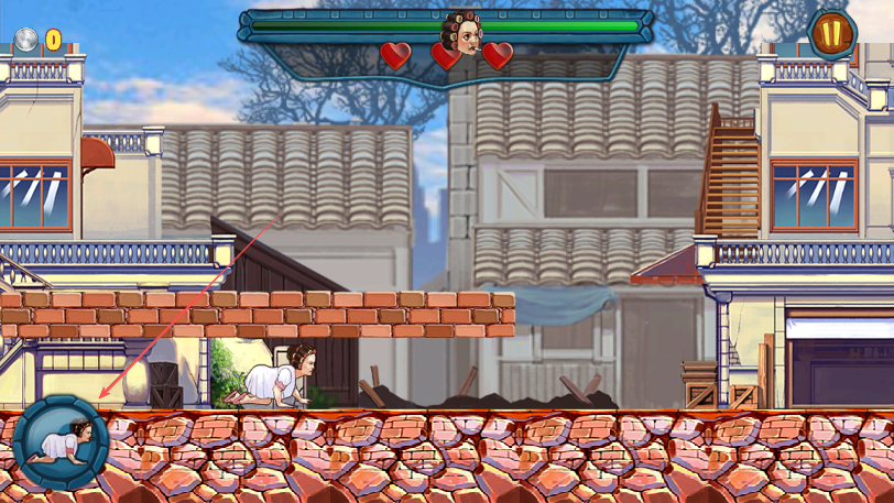2、进入游戏操控睡袍女汉子角色在砖石地面场景中移动,注意上方生命值三颗红心标志。