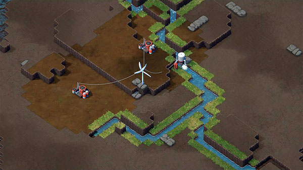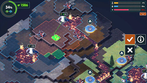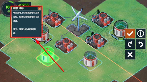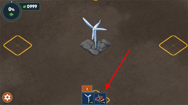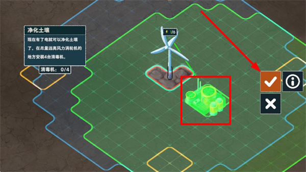 1、进入游戏后选择模式,先放置风力涡轮机获取电力,该设施需建在岩石区域,确认位置后点击对号完成建造。