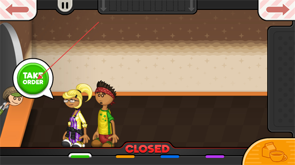 1、开始咖啡店的营业之旅,点击绿色按钮为顾客提供点餐服务。