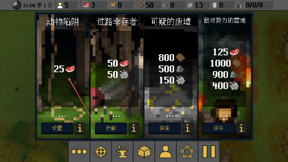 4、点击相应选项设置动物陷阱获取肉类资源,或选择拦截、探索、掠夺等获取其他资源,壮大营地实力。