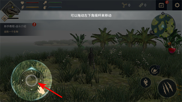 2、拖动左下角摇杆可控制恐龙移动,移动时需留意场景中的地形和资源分布,规划移动路线以高效探索或躲避危险。