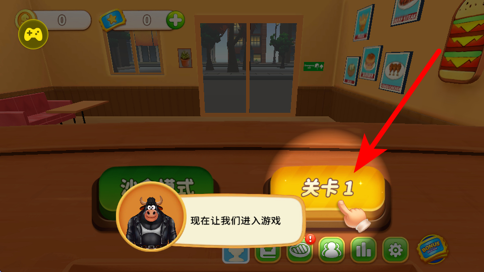 1、进入游戏后,选择关卡开始经营,比如点击关卡一,进入对应的汉堡店场景,准备开展经营活动。