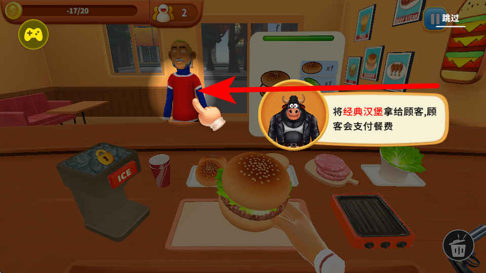 3、汉堡制作完成后,将做好的汉堡拿给顾客,顾客会支付餐费,以此获取经营的收益,推动店铺经营。