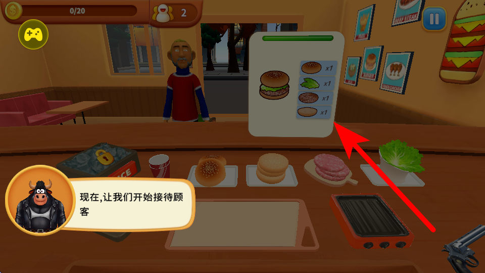 2、当有顾客前来时,查看顾客所需汉堡的配料等要求,根据提示准备相应的食材,制作出符合要求的汉堡。