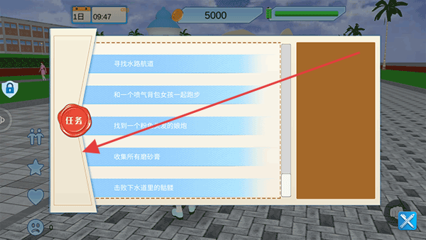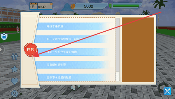 1、进入游戏,点击任务按钮,查看当天任务列表,如寻找水路航道收集所有磨砂膏等,明确游戏目标。