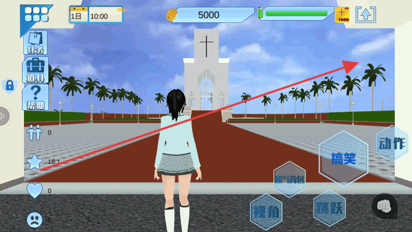 2、操控角色移动,利用屏幕右侧的动作按钮,如搞笑、喷气背包、跳跃等,进行互动和移动,探索校园场景。