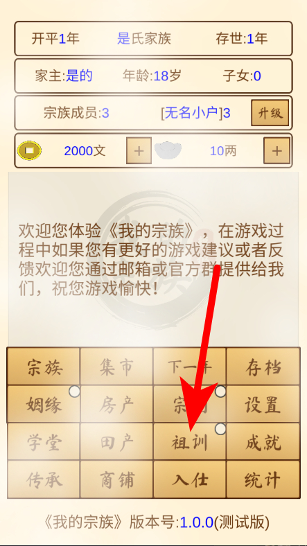 1、在游戏主界面,点击祖训选项,进入祖训功能页面。