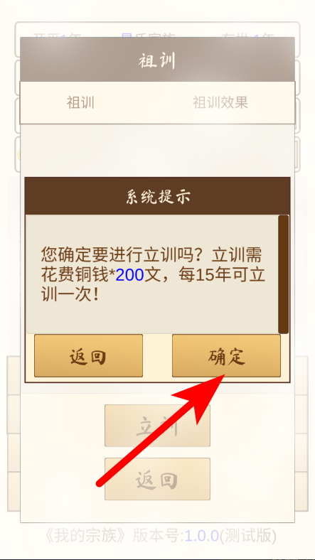 2、在祖训页面,点击立训按钮,触发立训确认提示。