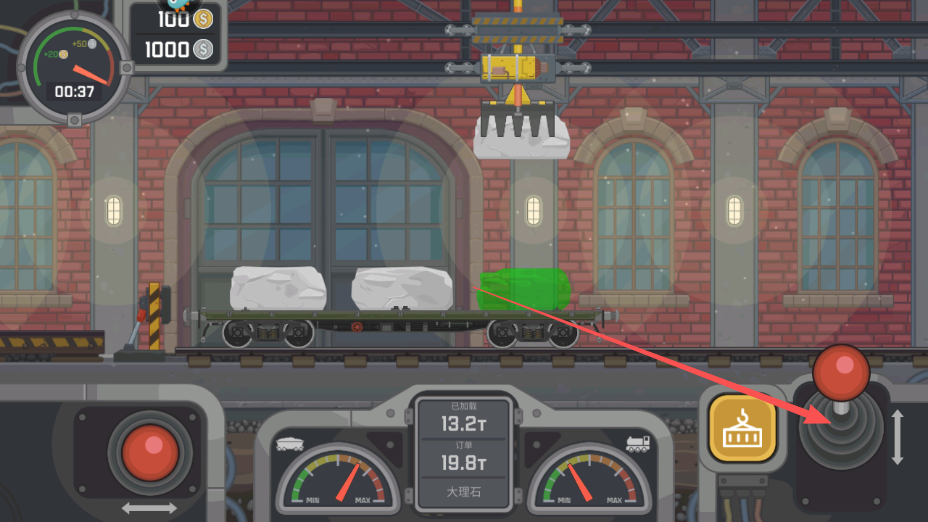 3、点击场景中的货物,使用上方的机械装置将货物搬运到火车车厢上。