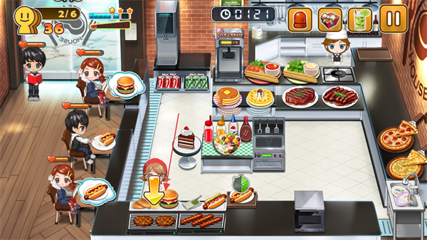 3、同时响应多位顾客的热狗、汉堡需求,依次制作并配送,提升分数。