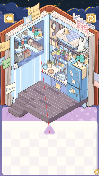 3、持续利用物品栏资源,填充房间细节,若有遗漏,会有箭头提示,营造温馨居住氛围。