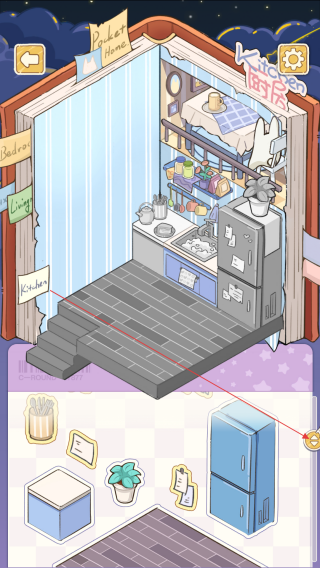 2、滑动物品栏,继续挑选冰箱等物件,丰富房间设施,完善厨房等区域布置。