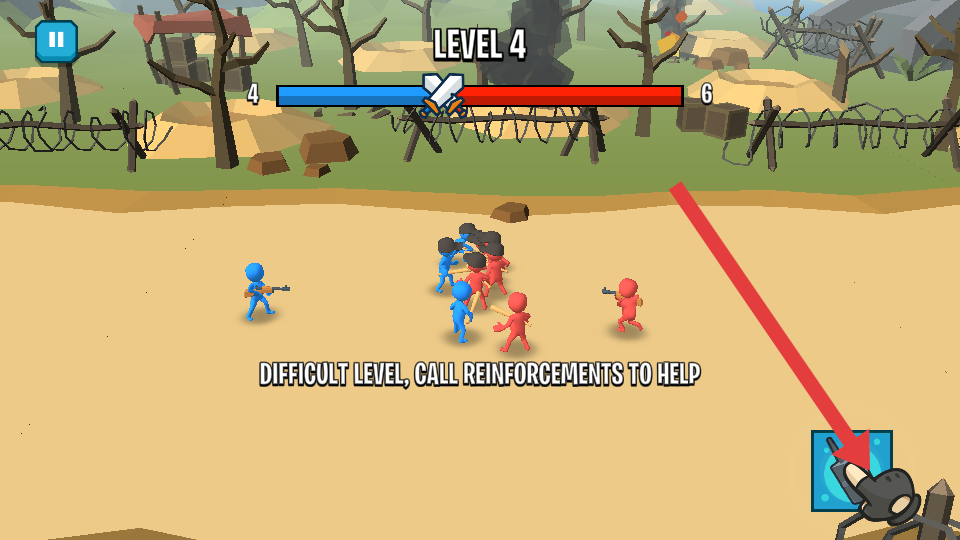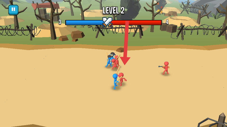 2、操控蓝色士兵与红色敌人交战,箭头指向的交战区域是战斗的核心地带,需集中兵力攻击。