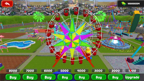 4、在设施界面,消耗资源点击Buy购买游乐设施,解锁新场景内容,丰富游戏体验。