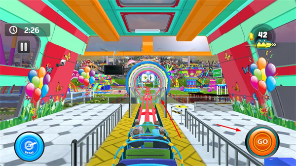 2、进入过山车关卡后,点击GO按钮启动运行,在限定时间内推进,同时收集场景中的奖励道具。