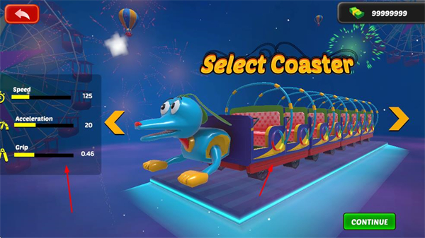 1、在选择界面,查看过山车属性,点击箭头切换款式,确认后点CONTINUE进入关卡。