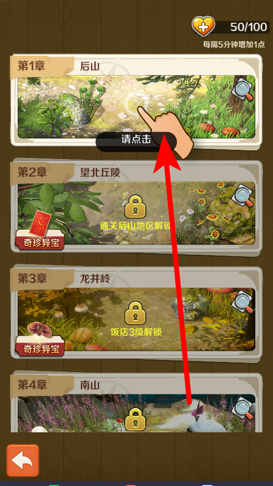 4、备货可前往不同区域,如第一章的后山,点击该区域就能进入,去获取所需的食材等物资,满足店铺经营的物料需求。