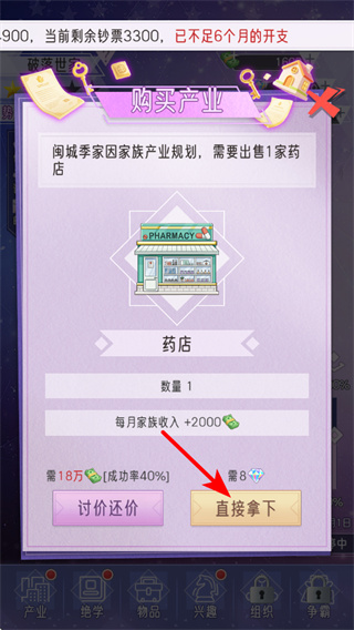 1、游戏中点击直接拿下按钮,可购买产业如药店,这是积累家族财富的关键操作,购买时需关注产业的收益和成功率。